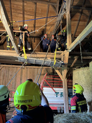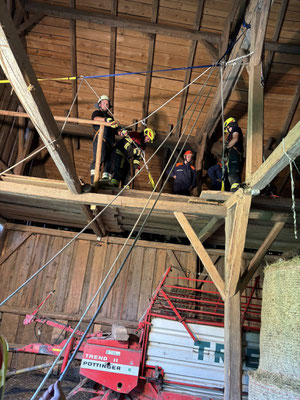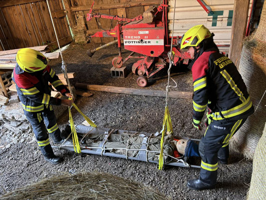 Konkret befand sich eine verletzte Person auf einem Zwischenboden eines Heustadels. Die verletzte Person wurde auf einer Trage gesichert abgeseilt.