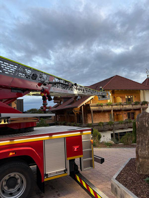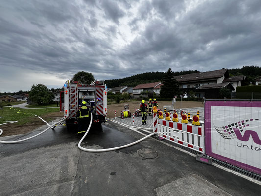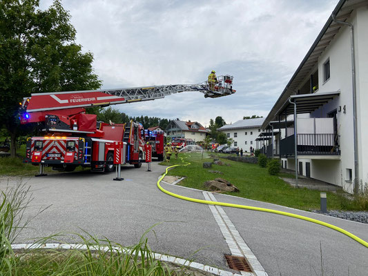 Die Drehleiter der Feuerwehr Zwiesel testete verschiedene Aufstellflächen für einen möglichen Einsatz am Objekt. Zudem wurde eine Löschwasserversorgung aufgebaut, die Wasserentnahme erfolgte aus der Zisterne.