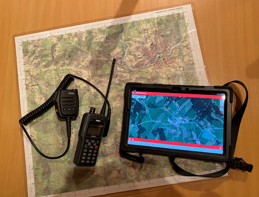 Funkübung mit verschieden Aufgaben zum Thema Erste Hilfe, Wasserentnahme, Kartenkunde und Wärmebildkamera.